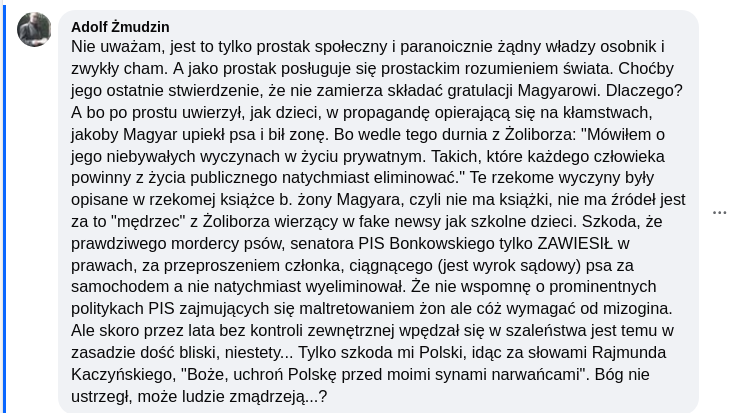 - Dobry wieczór. Ostatni mój post dotyczył szaleństwa Trumpa. Dzisiejszy mój post dotyczy szaleństwa Kaczyńskiego. Stopień moim zdaniem identyczny. I chociaż Trump wpływa na losy świata, a Kaczyński coraz mniej nawet na losy swojej partii, to jednak trzeba się zastanowić nad tym zjawiskiem, bo chociaż słupki poparcia są coraz mniejsze, to jednak nadal to druga siła w Polsce. Jak zwykle w takich wypadkach piszę z nadzieją, że ktoś z wyborców PiS , czy w ogóle opcji prawicowej to przeczyta.